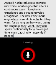 Android 4.0 introduces a powerful new voice input engine that offers a continuous "open microphone" experience and streaming voice recognition. The new voice input engine lets users dictate the text they want, for as long as they want, using the language they want. Users can speak continously for a prolonged time, even pausing for intervals if needed, and dictate punctuation to create correct sentences. As the voice input engine enters text, it underlines possible dictation errors in gray. After dictating, users can tap the underlined words to quickly replace them from a list of suggestions.