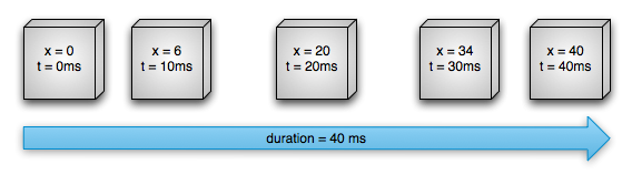 horizontally by 10 pixels. At the end of 40ms, the animation stops, and the object ends at